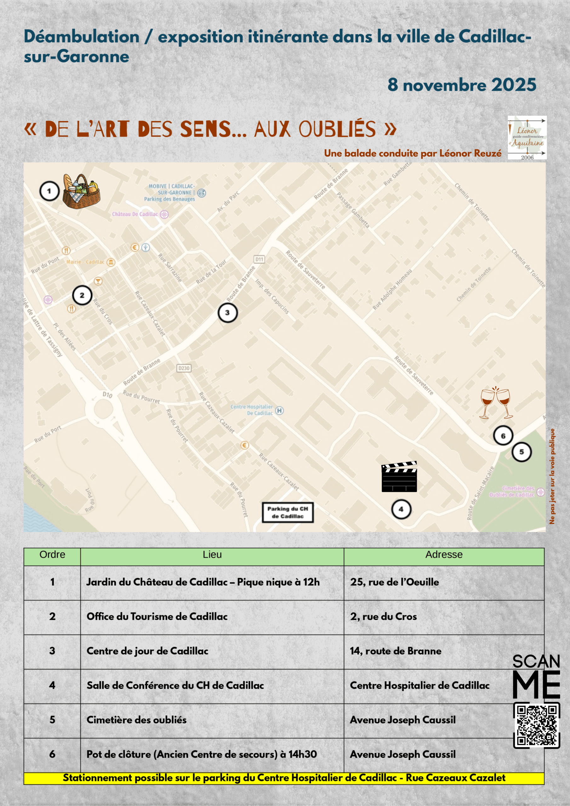 La balade vous mènera des jardins du château, avec une exposition photographique, à l’office de tourisme, puis par le Centre de jour de Cadillac, avant de se rendre au Centre Hospitalier et se terminant au Cimetière des Oubliés, lieu hautement symbolique. Un pot de clôture sera offert.