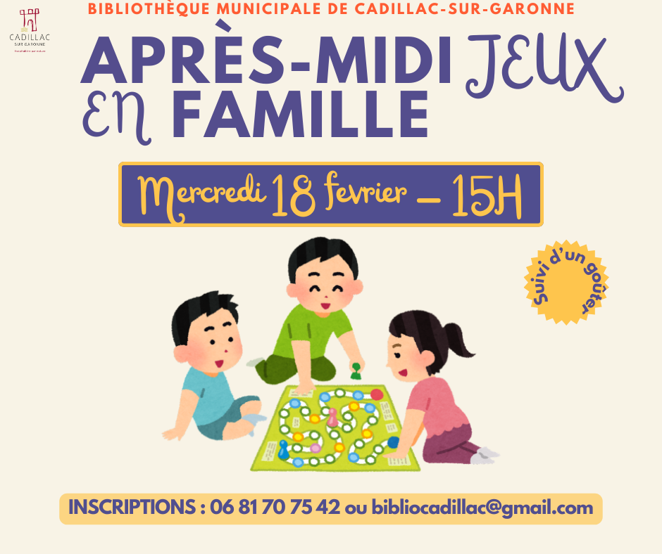 Pendant les vacances, les bénévoles de la bibliothèque municipale de Cadillac-sur-Garonne vous invitent à une après-midi ludique à la bibliothèque municipale, le mercredi 18 février à 15h.